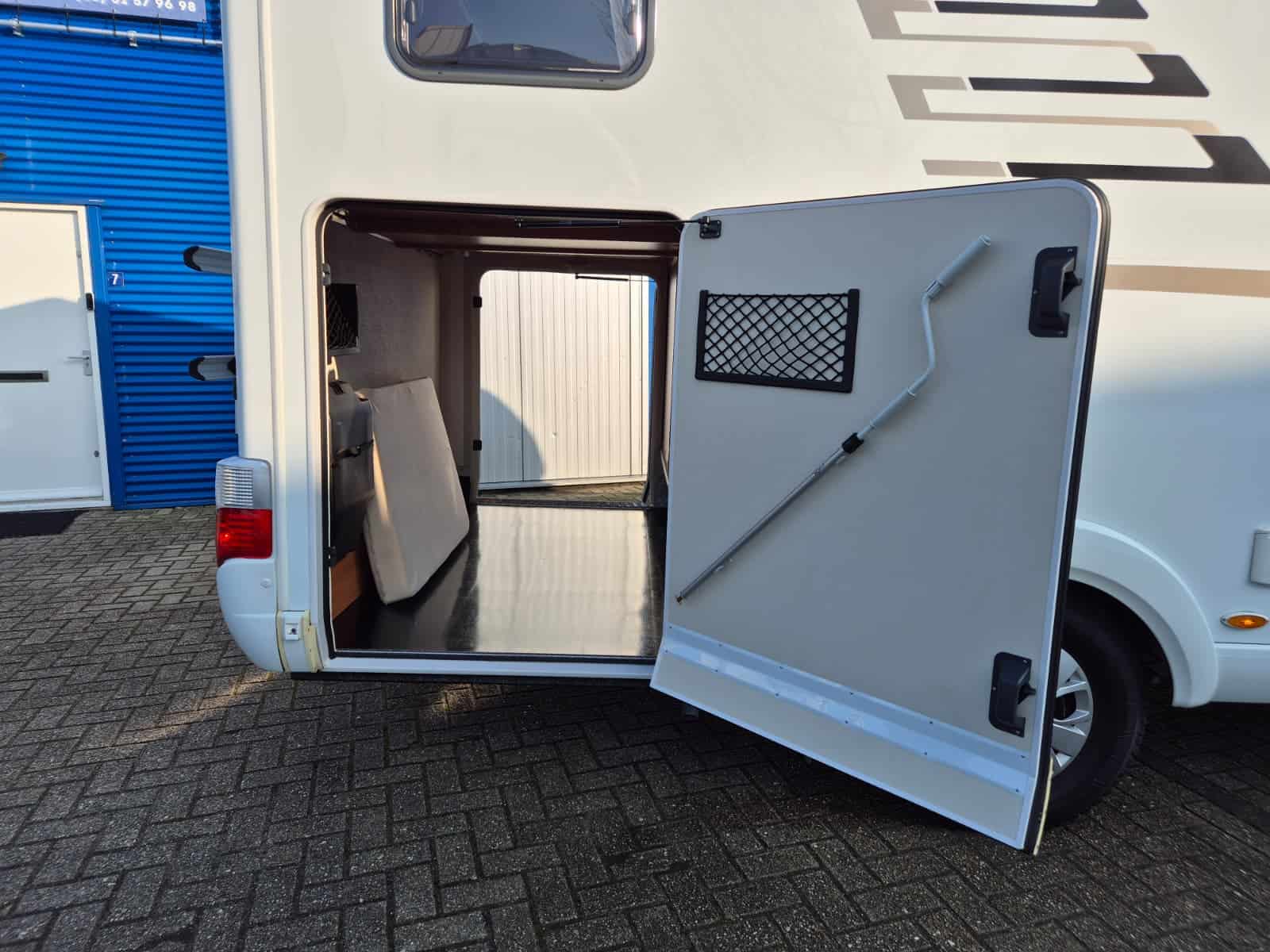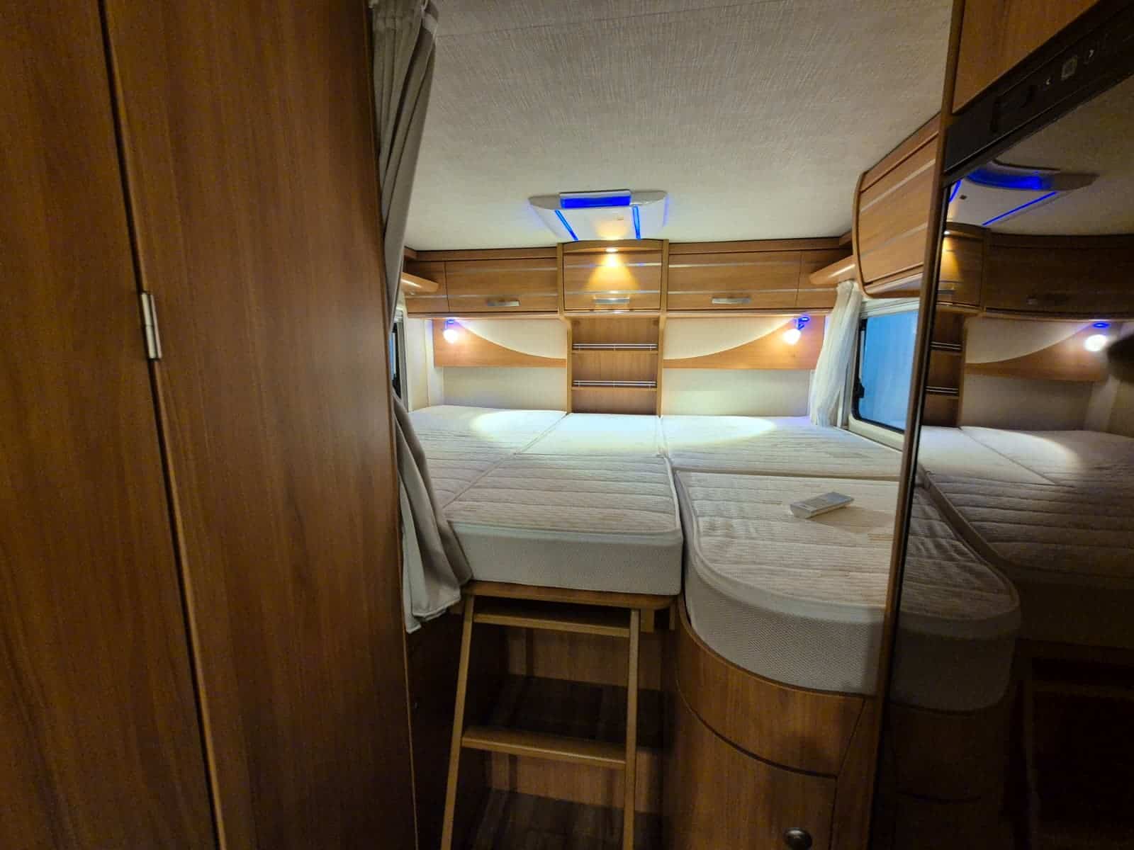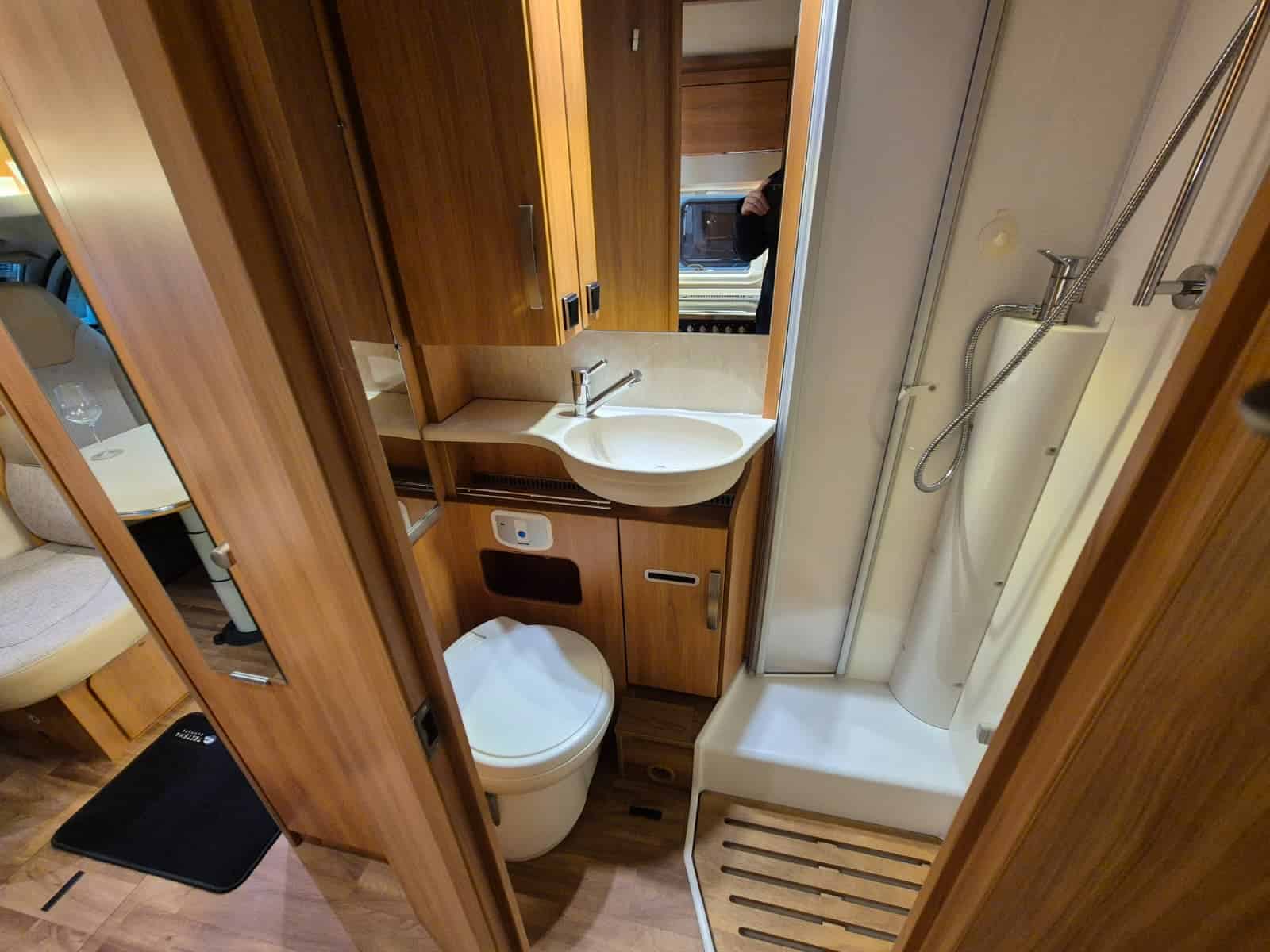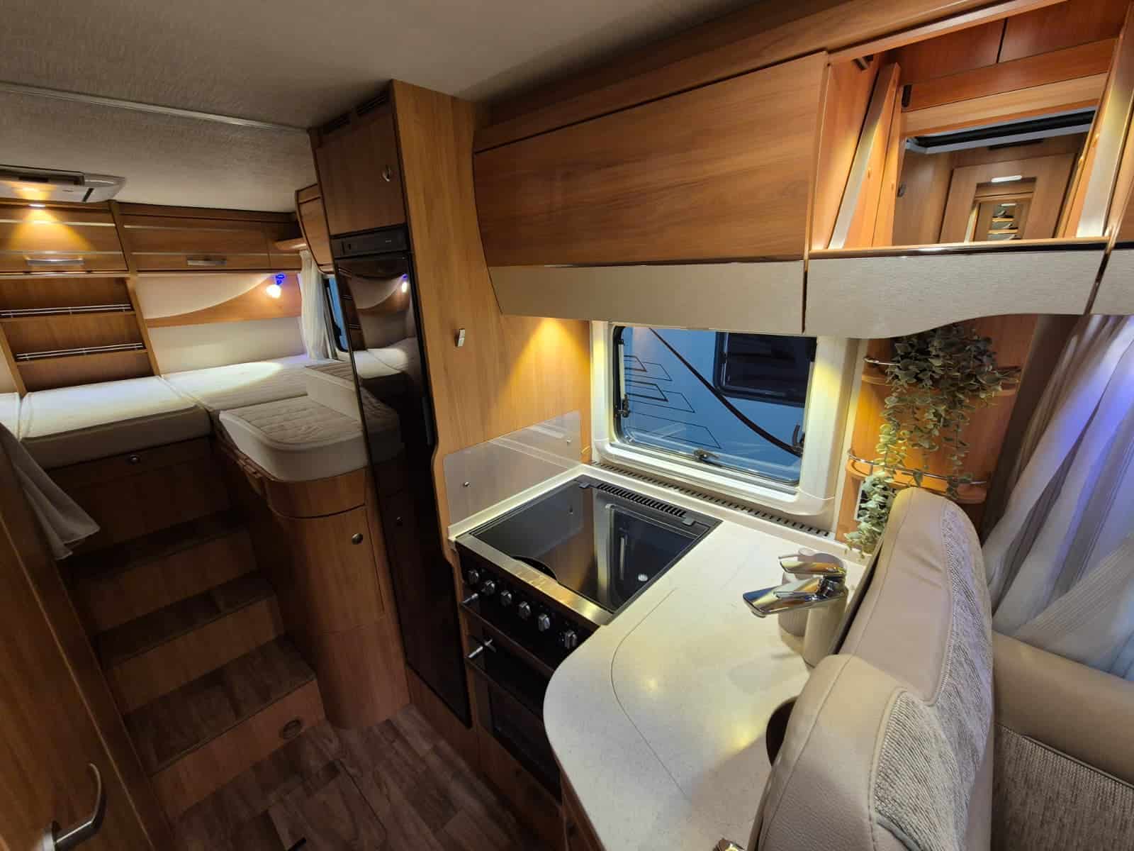 Middenkeuken 3-pits gascomfort Oven & grill Grote koelkast (135 liter) met vriesvak Spoelbak met kraan Veel kastruimte en hangkasten Dubbele bodem Sanitair Badkamer in middenopstelling Afgesloten douchecabine Wastafel Cassettetoilet Wintervaste schoon- en vuilwatertanks Comfort & Voorzieningen Ringverwarming (wintervast – geschikt voor alle seizoenen) 2x zonnepaneel Omvormer 2000W 2 huishoudaccu’s 2x airco (opbouw) Panoramadak Verduistering en horren rondom + cabine Indirecte sfeerverlichting en leeslampjes Luifel Hordeur Buitenlamp Zeer grote XXL-garage