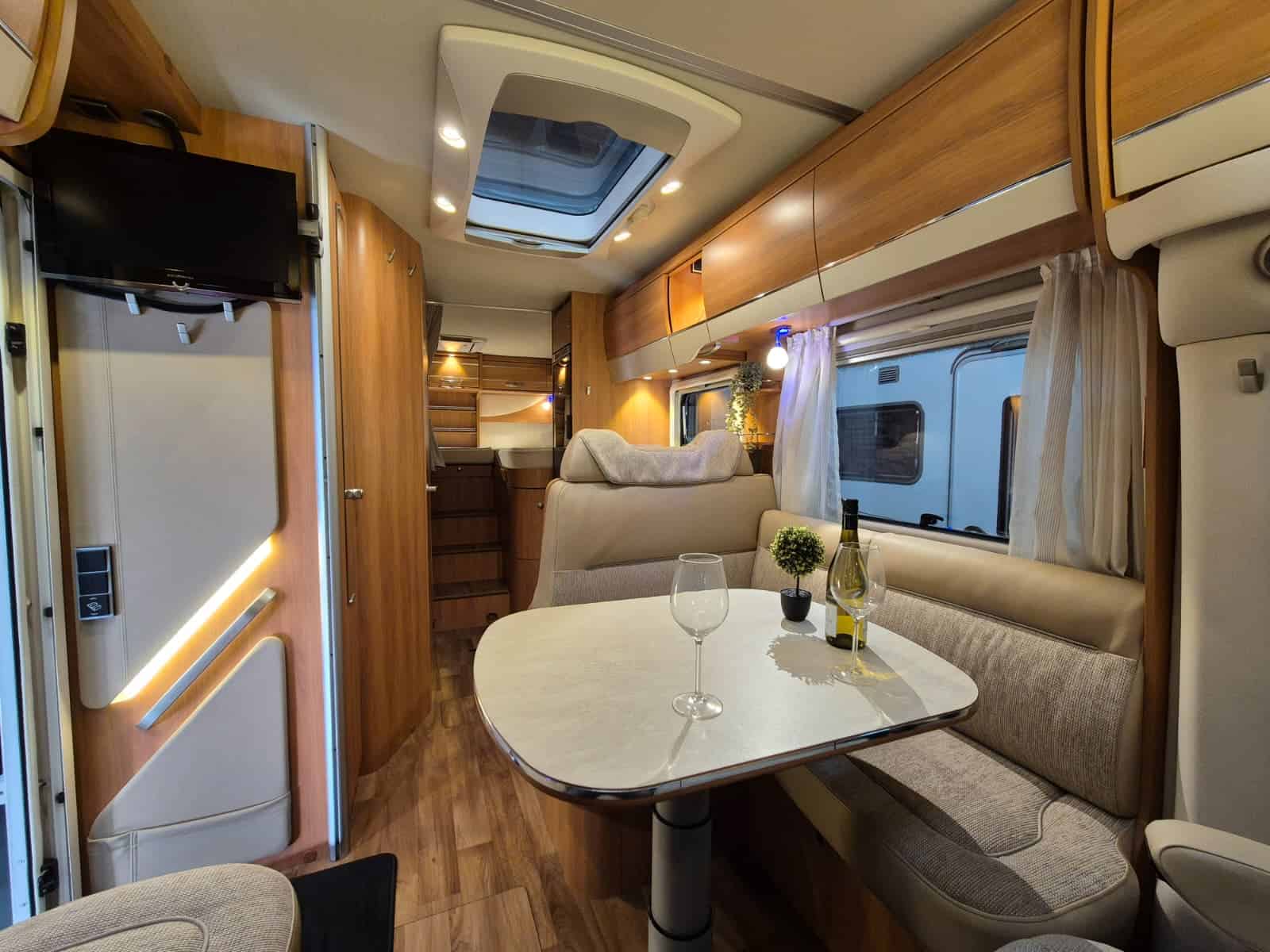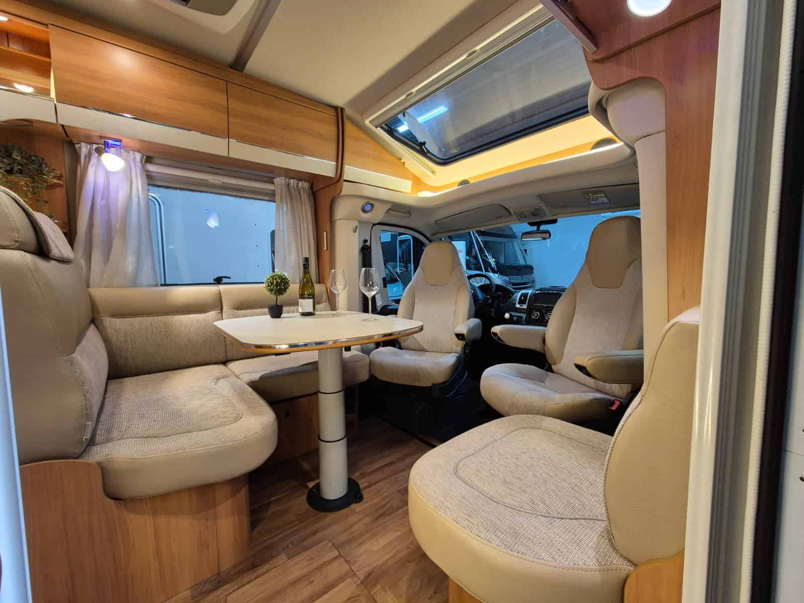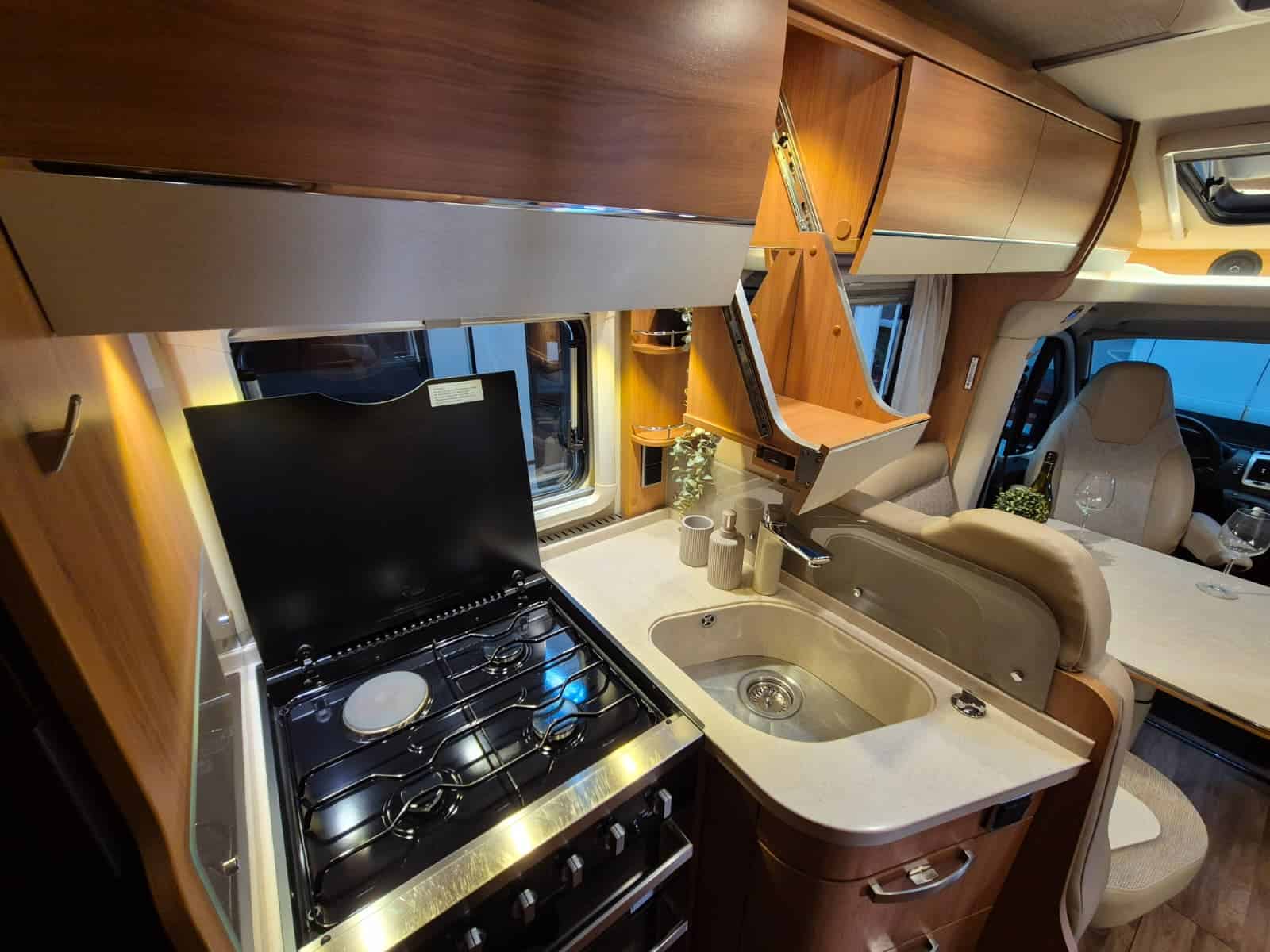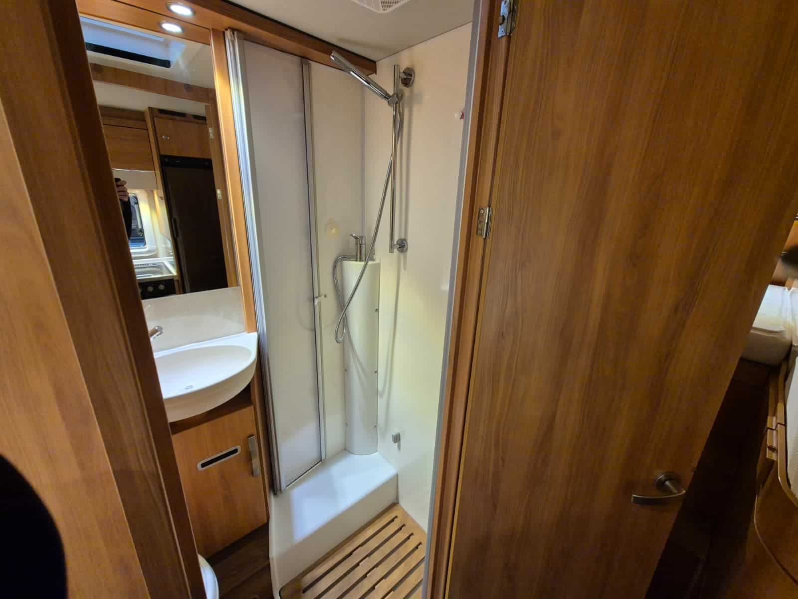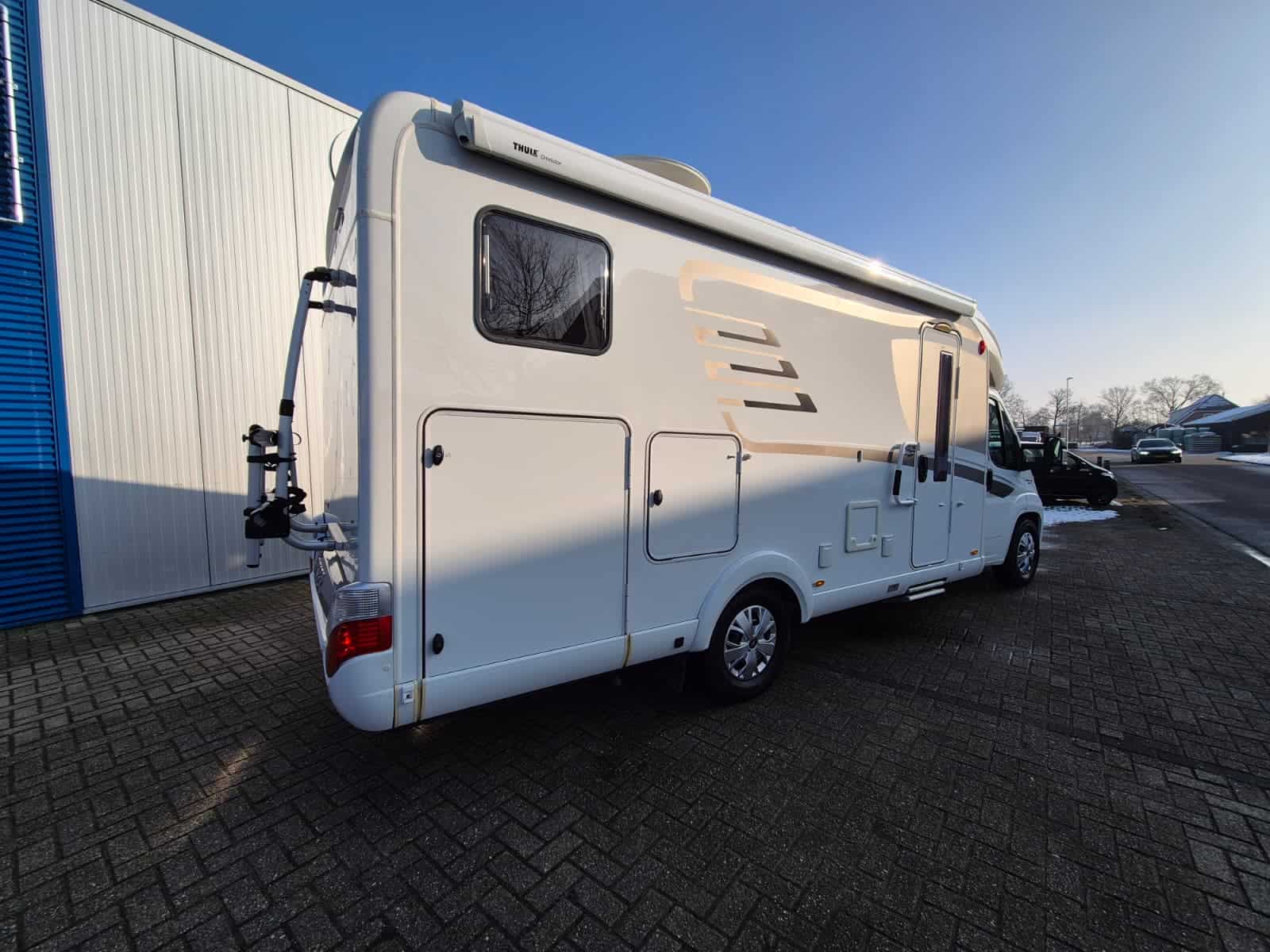 Middenkeuken 3-pits gascomfort Oven & grill Grote koelkast (135 liter) met vriesvak Spoelbak met kraan Veel kastruimte en hangkasten Dubbele bodem Sanitair Badkamer in middenopstelling Afgesloten douchecabine Wastafel Cassettetoilet Wintervaste schoon- en vuilwatertanks Comfort & Voorzieningen Ringverwarming (wintervast – geschikt voor alle seizoenen) 2x zonnepaneel Omvormer 2000W 2 huishoudaccu’s 2x airco (opbouw) Panoramadak Verduistering en horren rondom + cabine Indirecte sfeerverlichting en leeslampjes Luifel Hordeur Buitenlamp Zeer grote XXL-garage