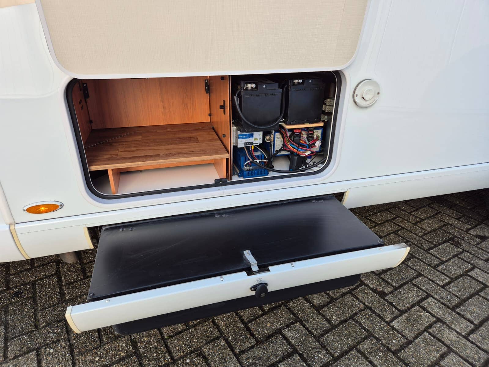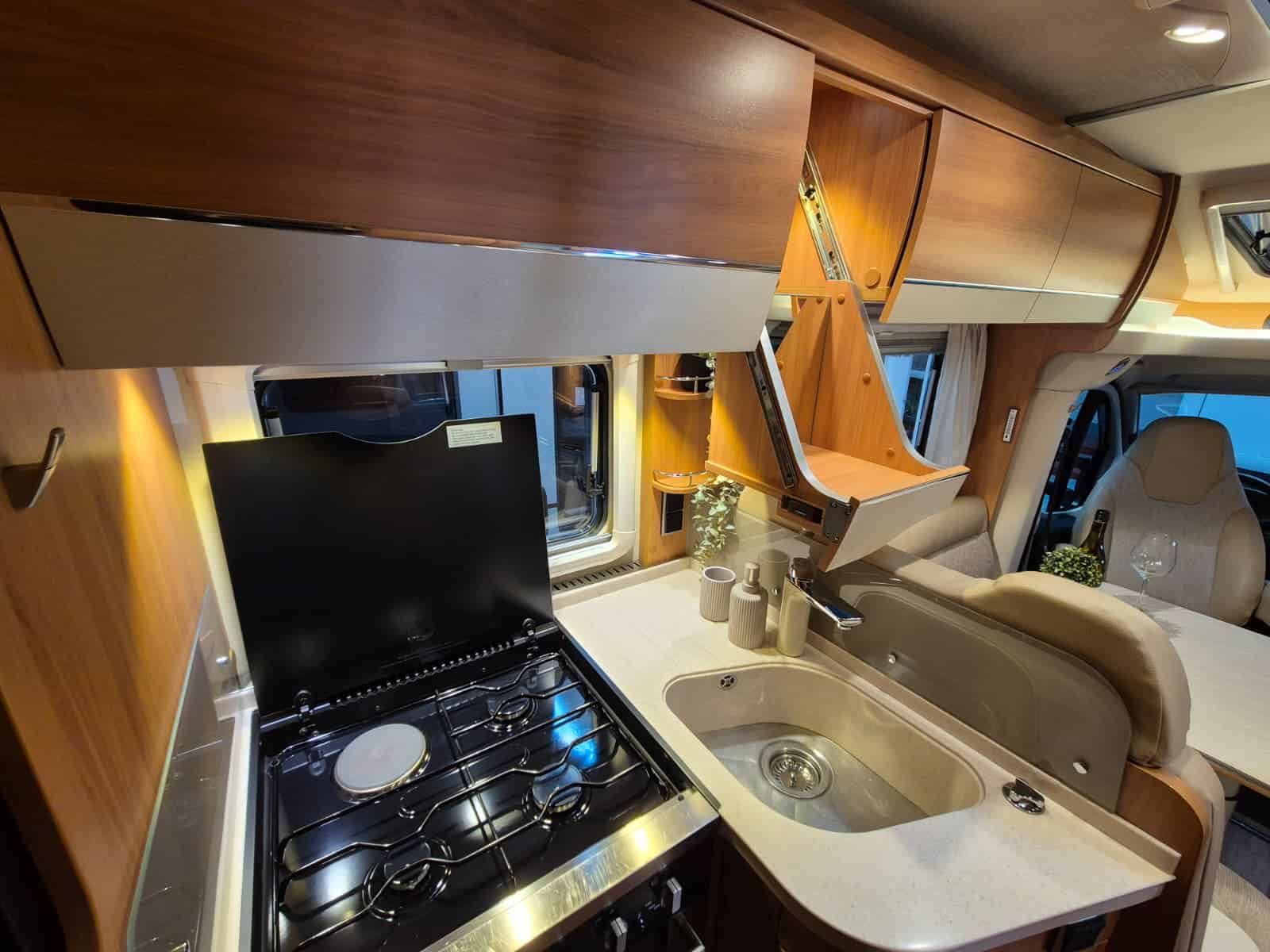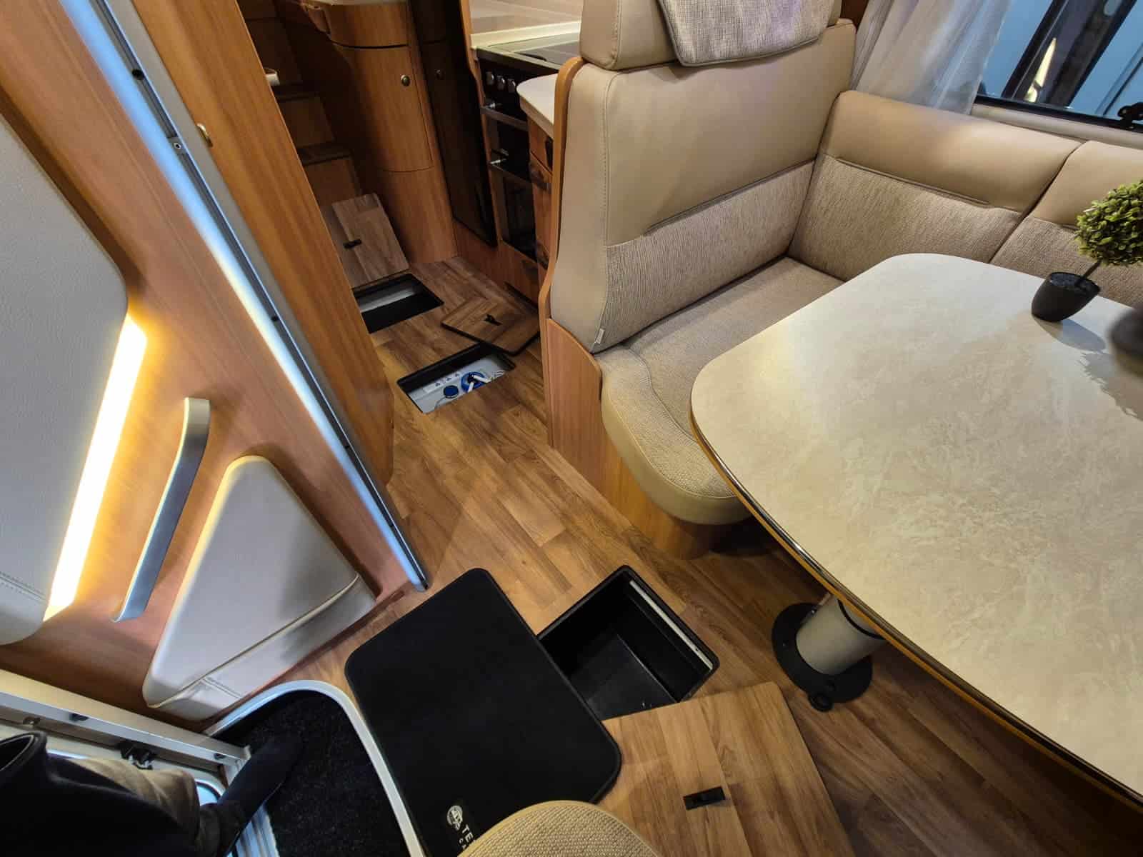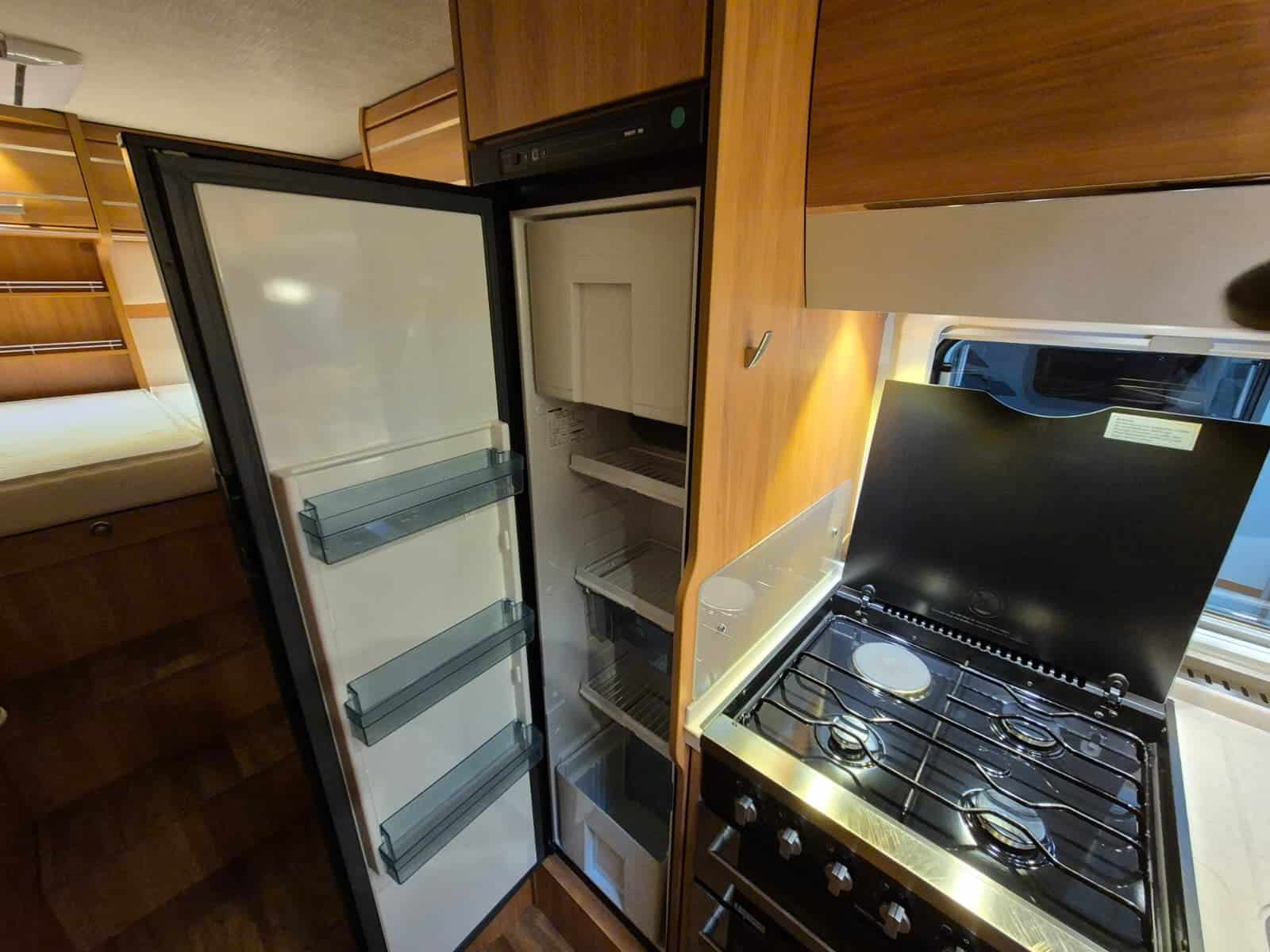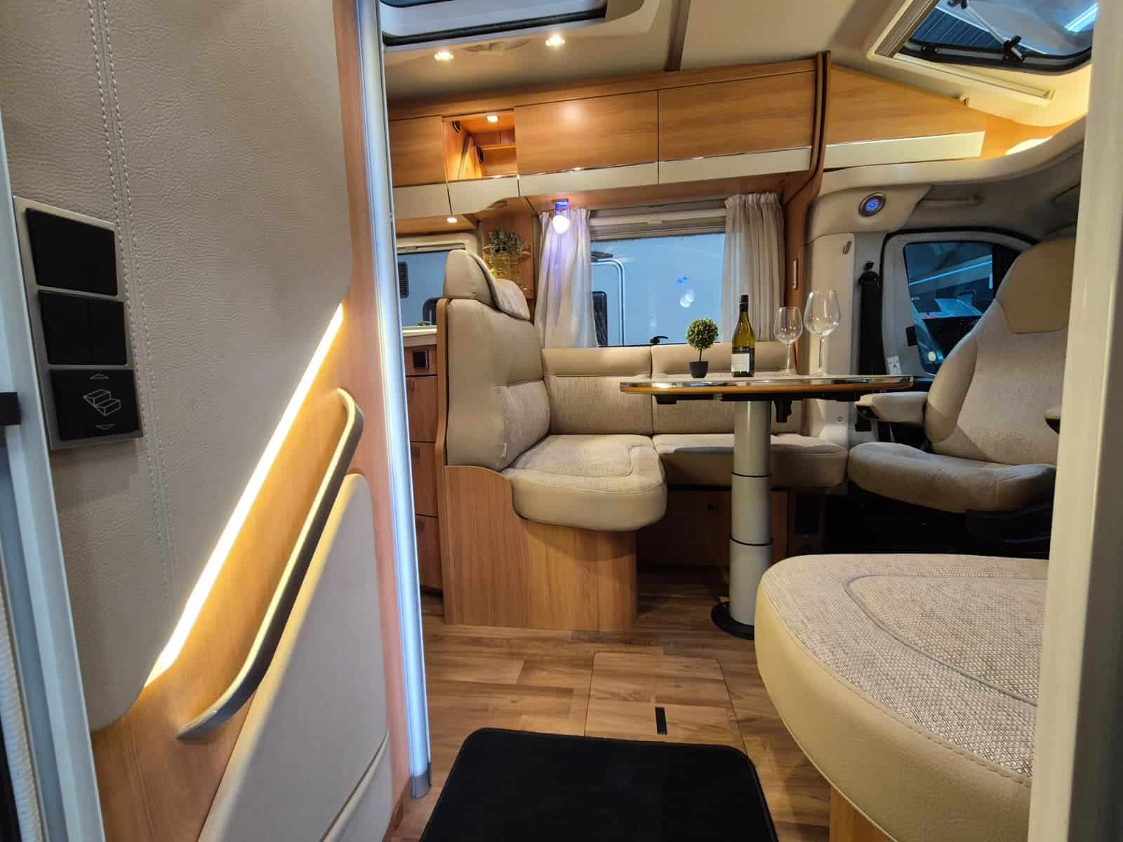 Middenkeuken 3-pits gascomfort Oven & grill Grote koelkast (135 liter) met vriesvak Spoelbak met kraan Veel kastruimte en hangkasten Dubbele bodem Sanitair Badkamer in middenopstelling Afgesloten douchecabine Wastafel Cassettetoilet Wintervaste schoon- en vuilwatertanks Comfort & Voorzieningen Ringverwarming (wintervast – geschikt voor alle seizoenen) 2x zonnepaneel Omvormer 2000W 2 huishoudaccu’s 2x airco (opbouw) Panoramadak Verduistering en horren rondom + cabine Indirecte sfeerverlichting en leeslampjes Luifel Hordeur Buitenlamp Zeer grote XXL-garage
