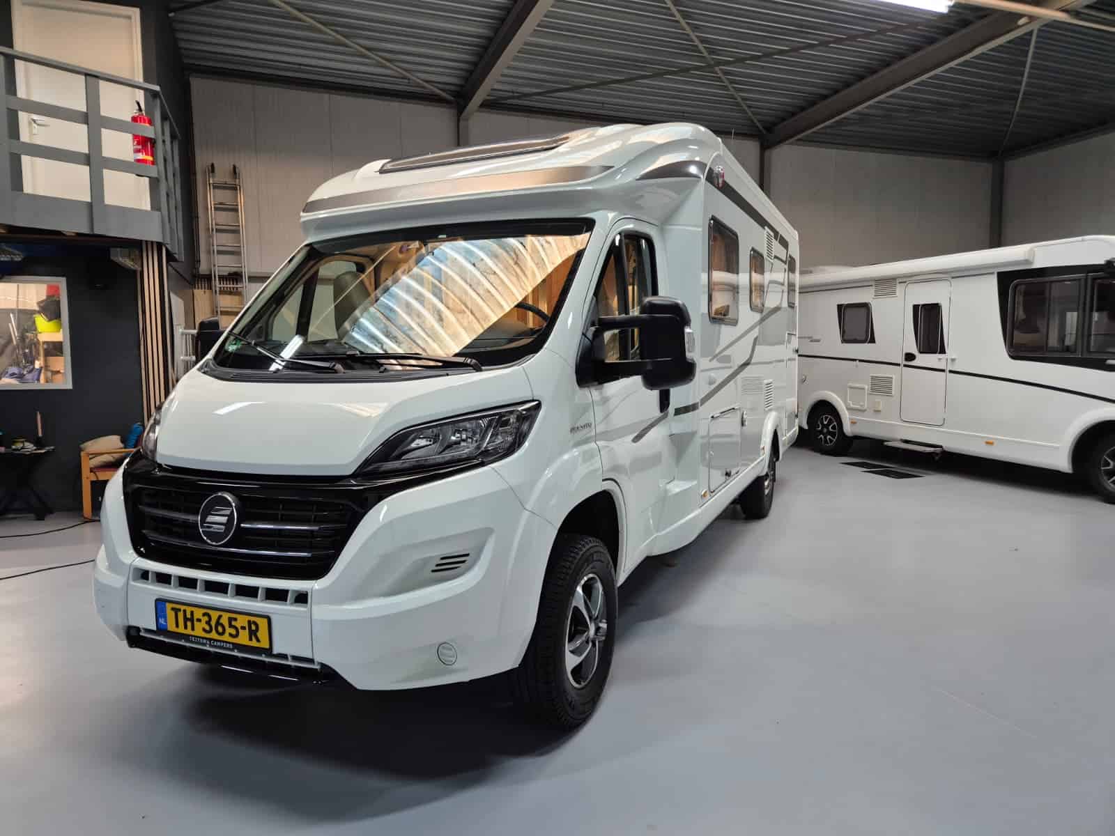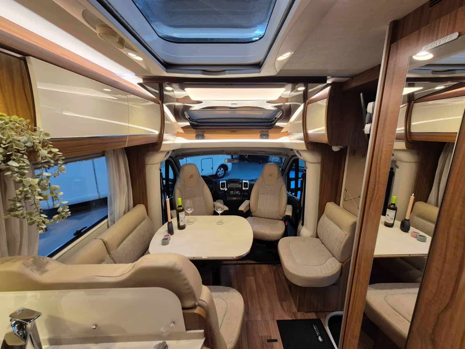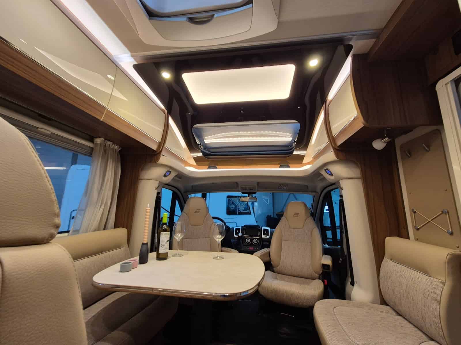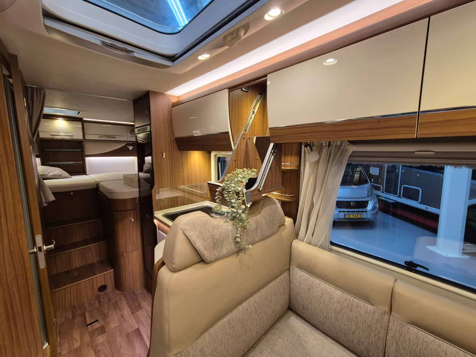 Comfort & Voorzieningen Ringverwarming (wintervast, geschikt voor alle seizoenen) Hydraulisch levelsysteem (Amplo) met afstandsbediening Zonnepaneel 2 huishoudaccu’s Panoramadak Verduistering en horren rondom + cabine Indirecte verlichting, leeslampjes en sfeerverlichting Buitenlamp Luifel Hordeur Zeer grote XXL-garage achterin