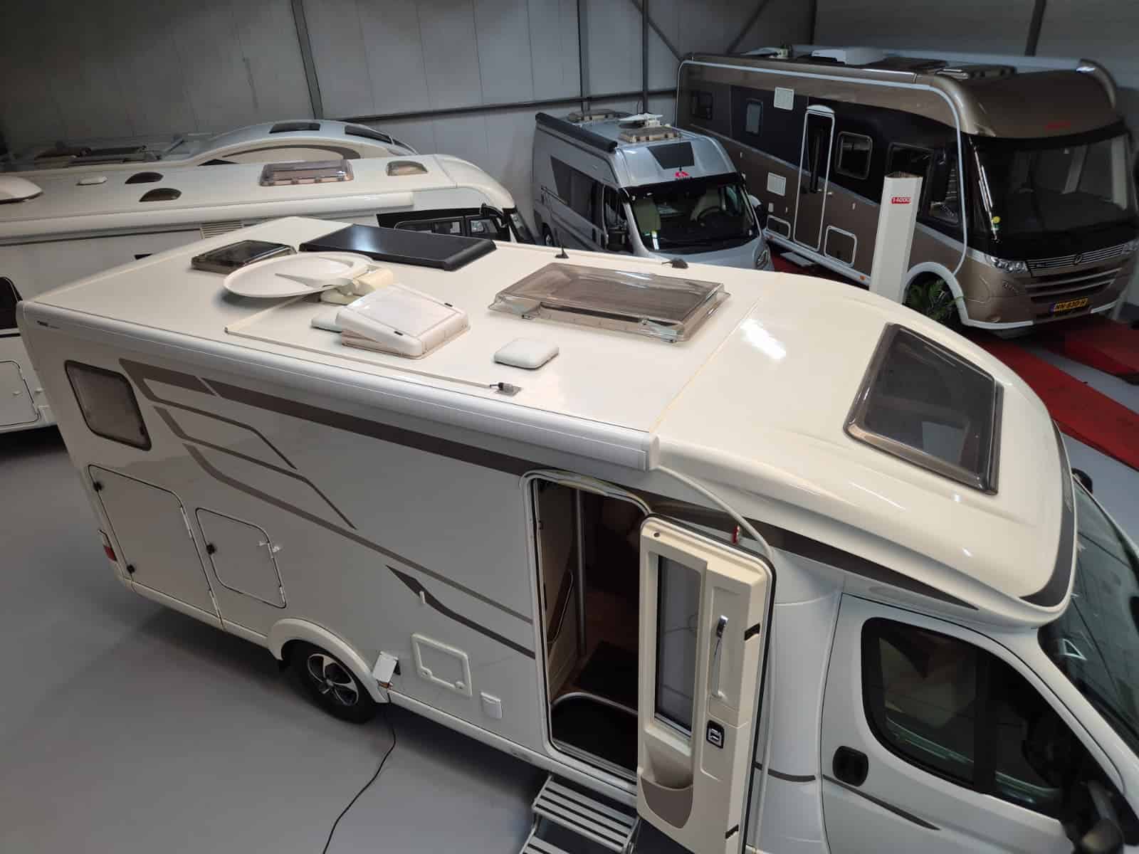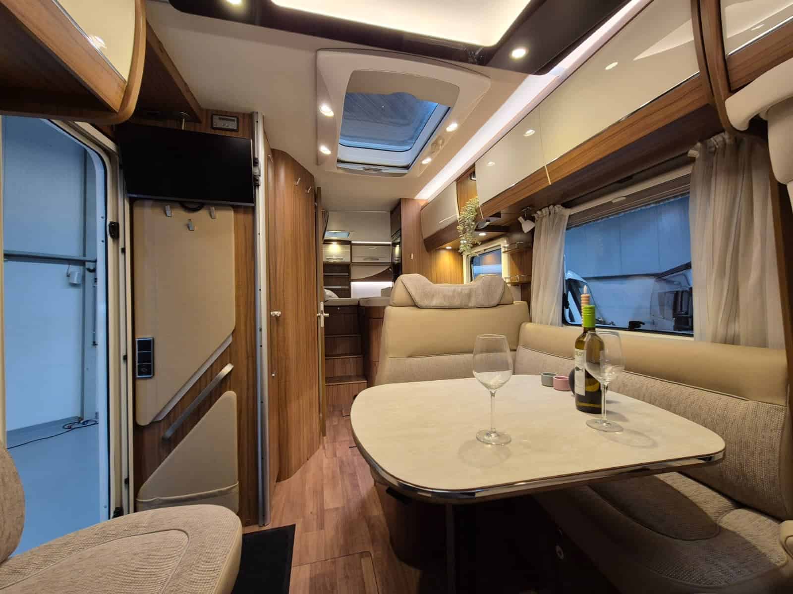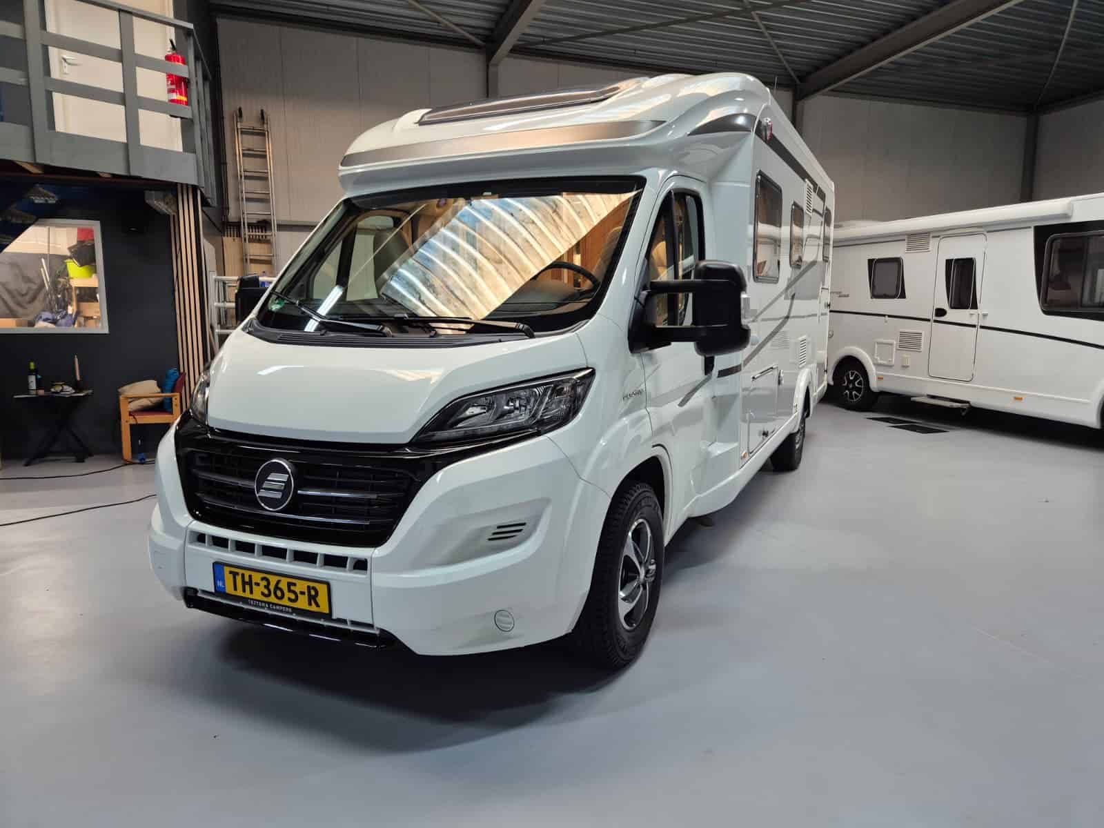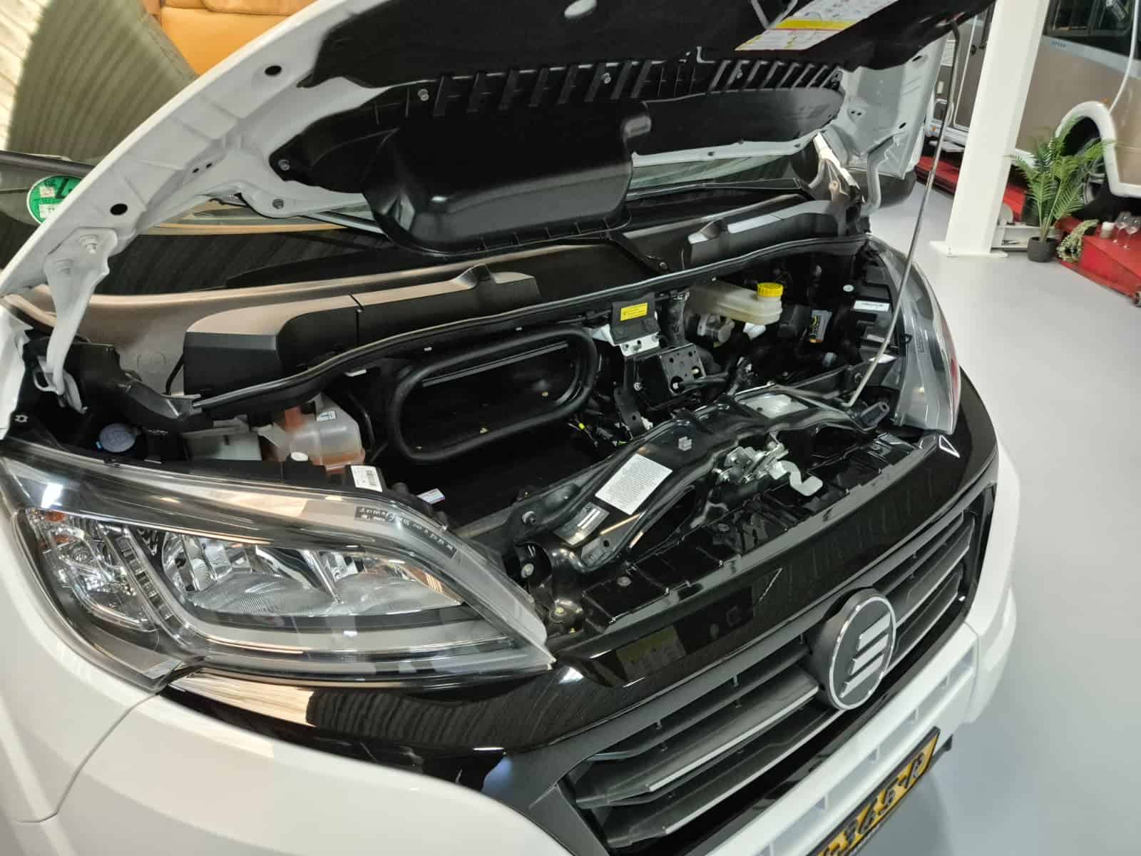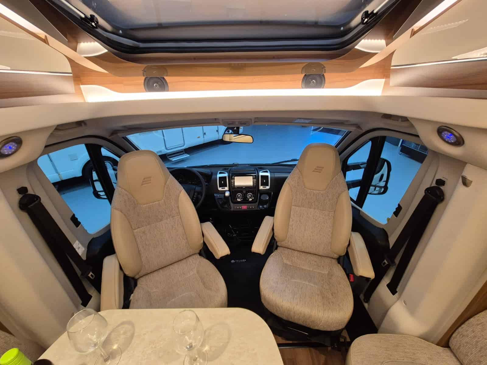 Comfort & Voorzieningen Ringverwarming (wintervast, geschikt voor alle seizoenen) Hydraulisch levelsysteem (Amplo) met afstandsbediening Zonnepaneel 2 huishoudaccu’s Panoramadak Verduistering en horren rondom + cabine Indirecte verlichting, leeslampjes en sfeerverlichting Buitenlamp Luifel Hordeur Zeer grote XXL-garage achterin