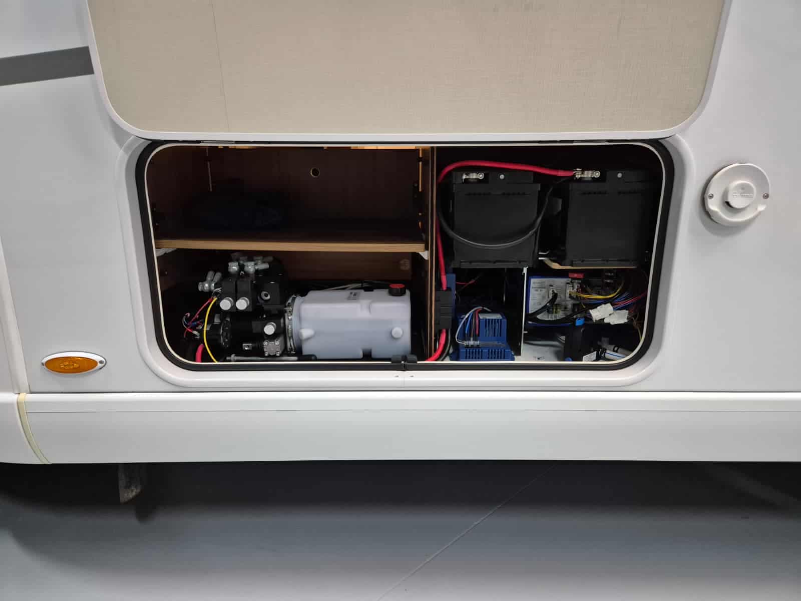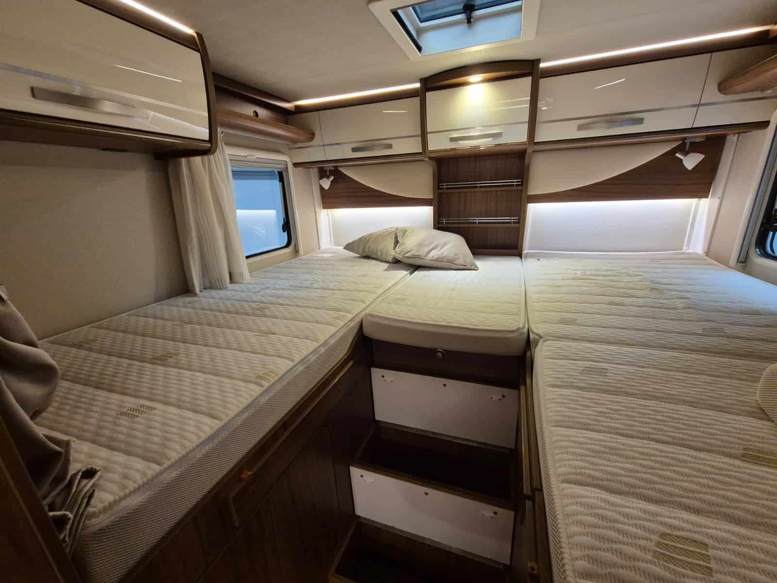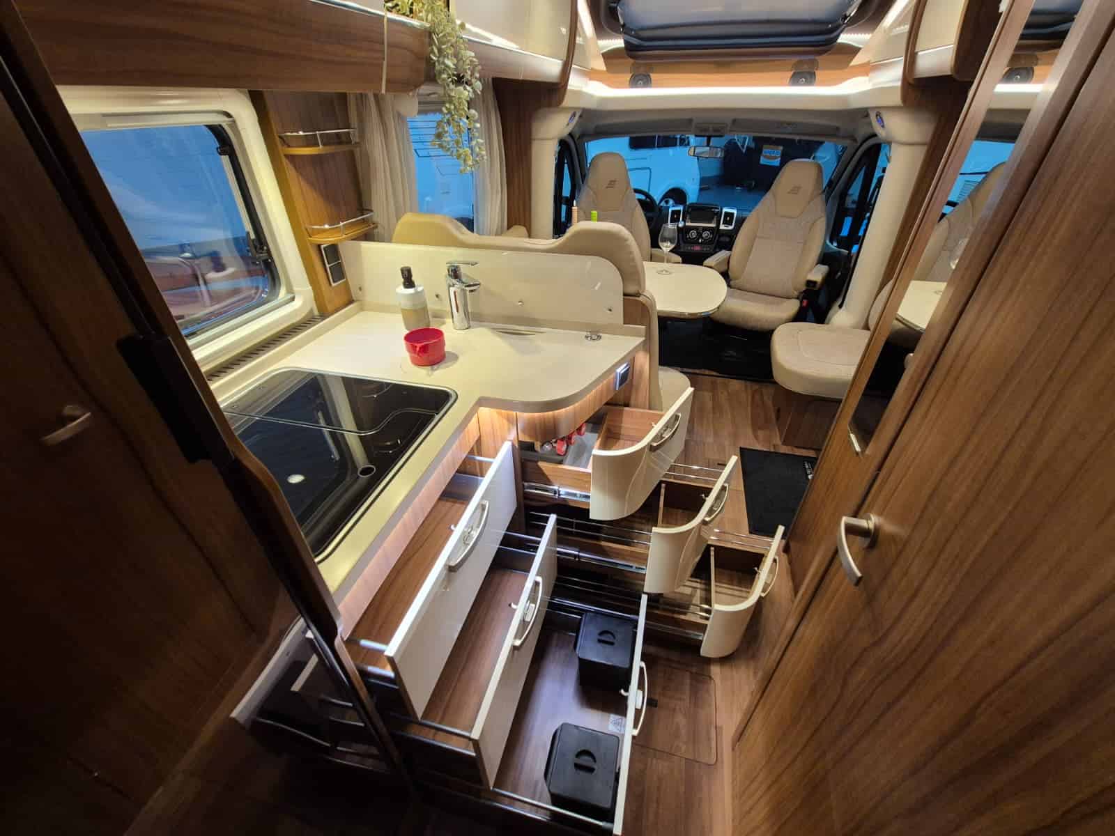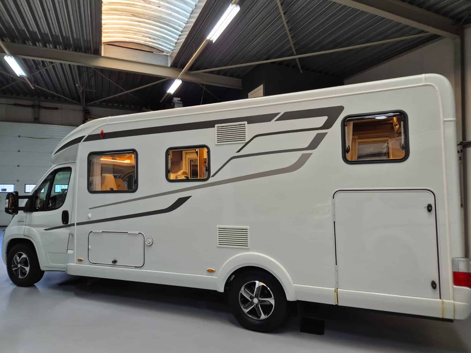 Comfort & Voorzieningen Ringverwarming (wintervast, geschikt voor alle seizoenen) Hydraulisch levelsysteem (Amplo) met afstandsbediening Zonnepaneel 2 huishoudaccu’s Panoramadak Verduistering en horren rondom + cabine Indirecte verlichting, leeslampjes en sfeerverlichting Buitenlamp Luifel Hordeur Zeer grote XXL-garage achterin
