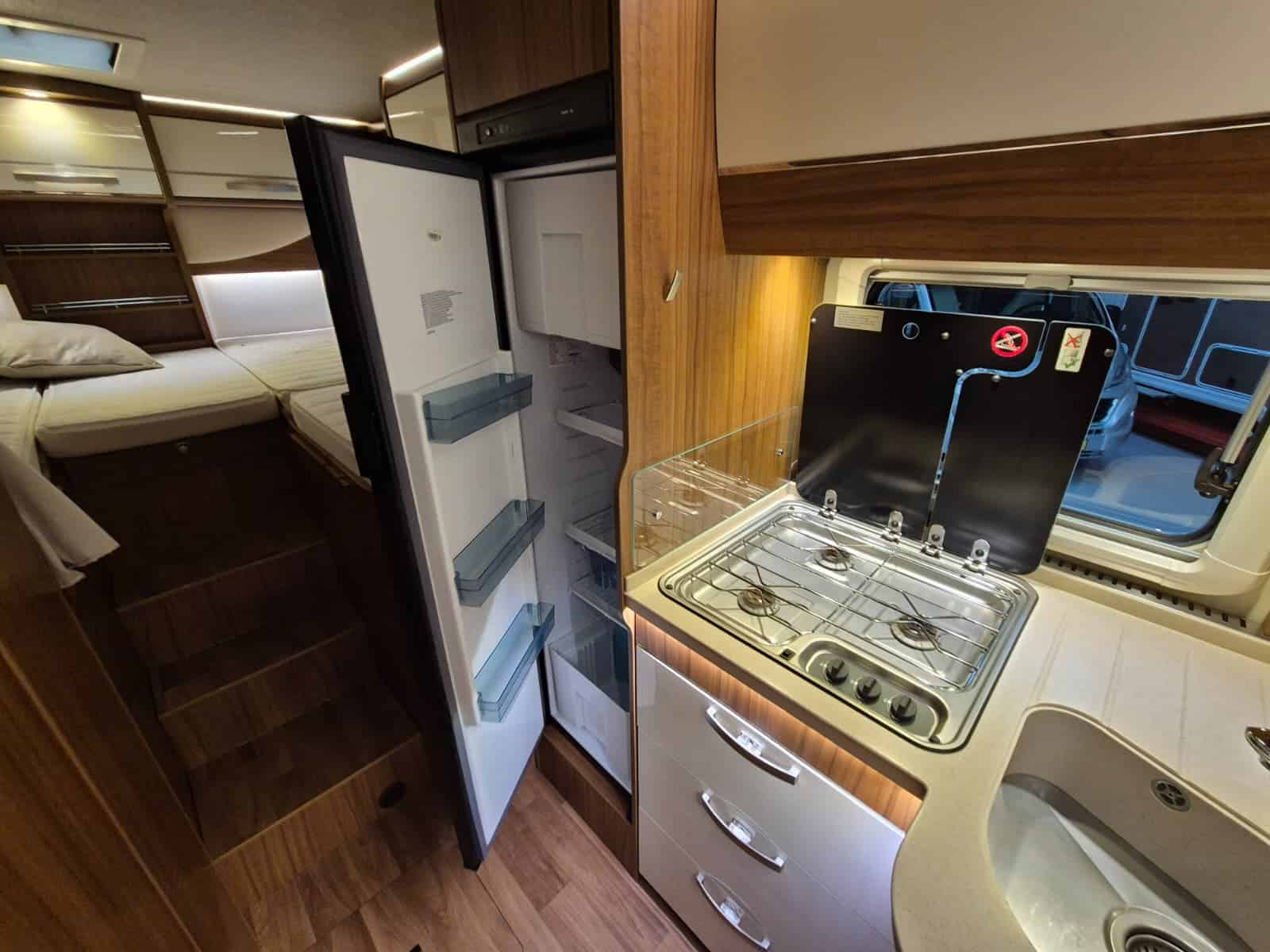 Middenkeuken met 3-pits gascomfort Grote koelkast (135 liter) met vriesvak Spoelbak met kraan Veel kastruimte