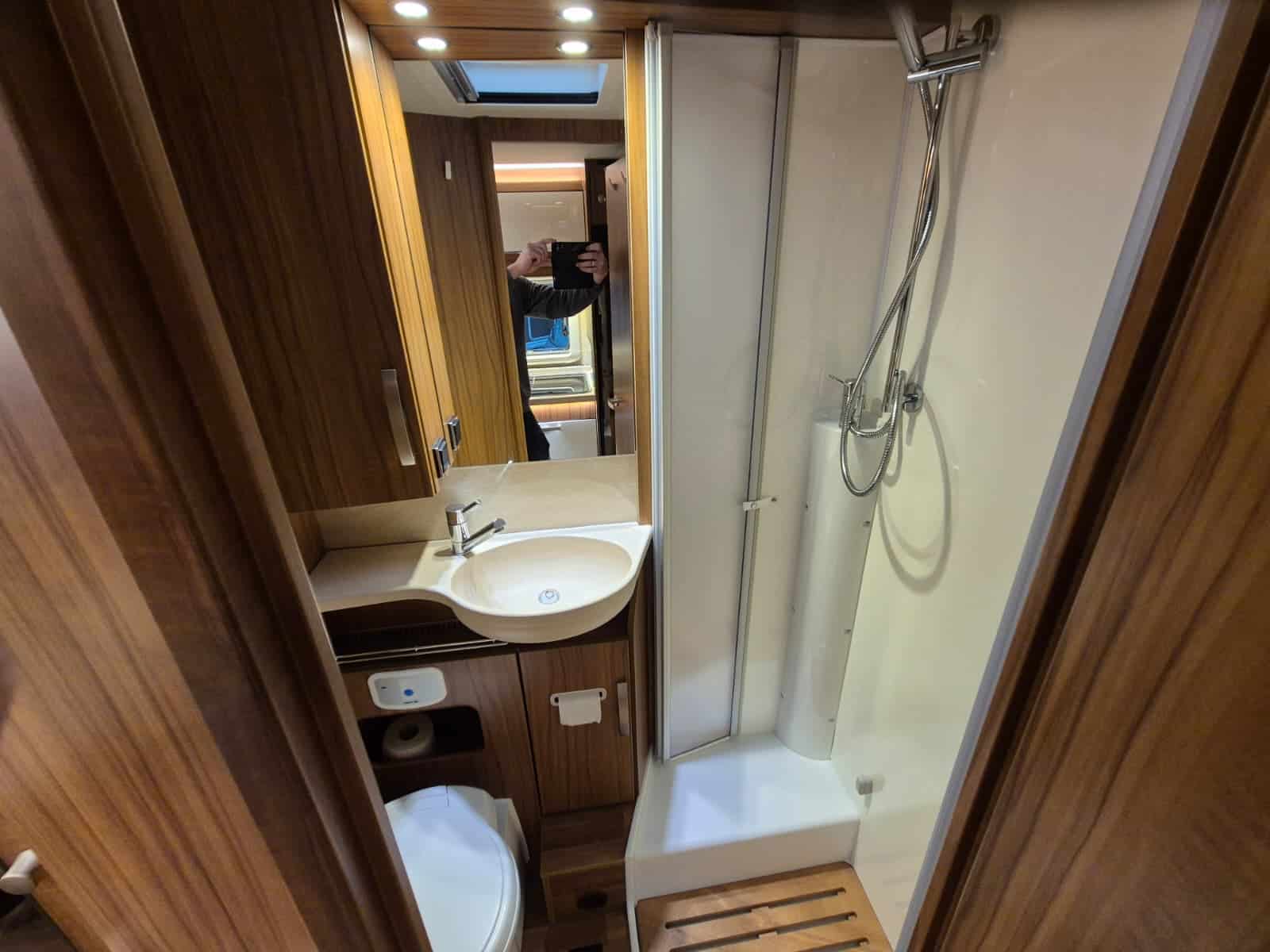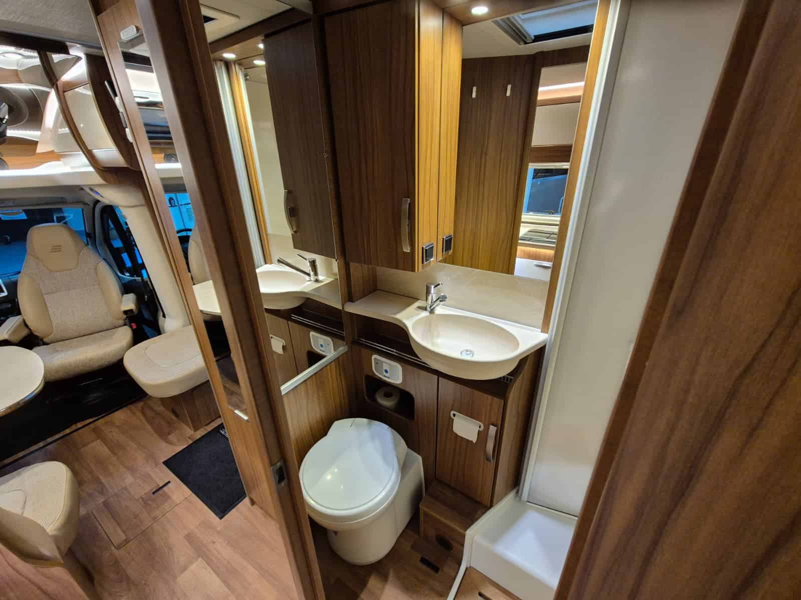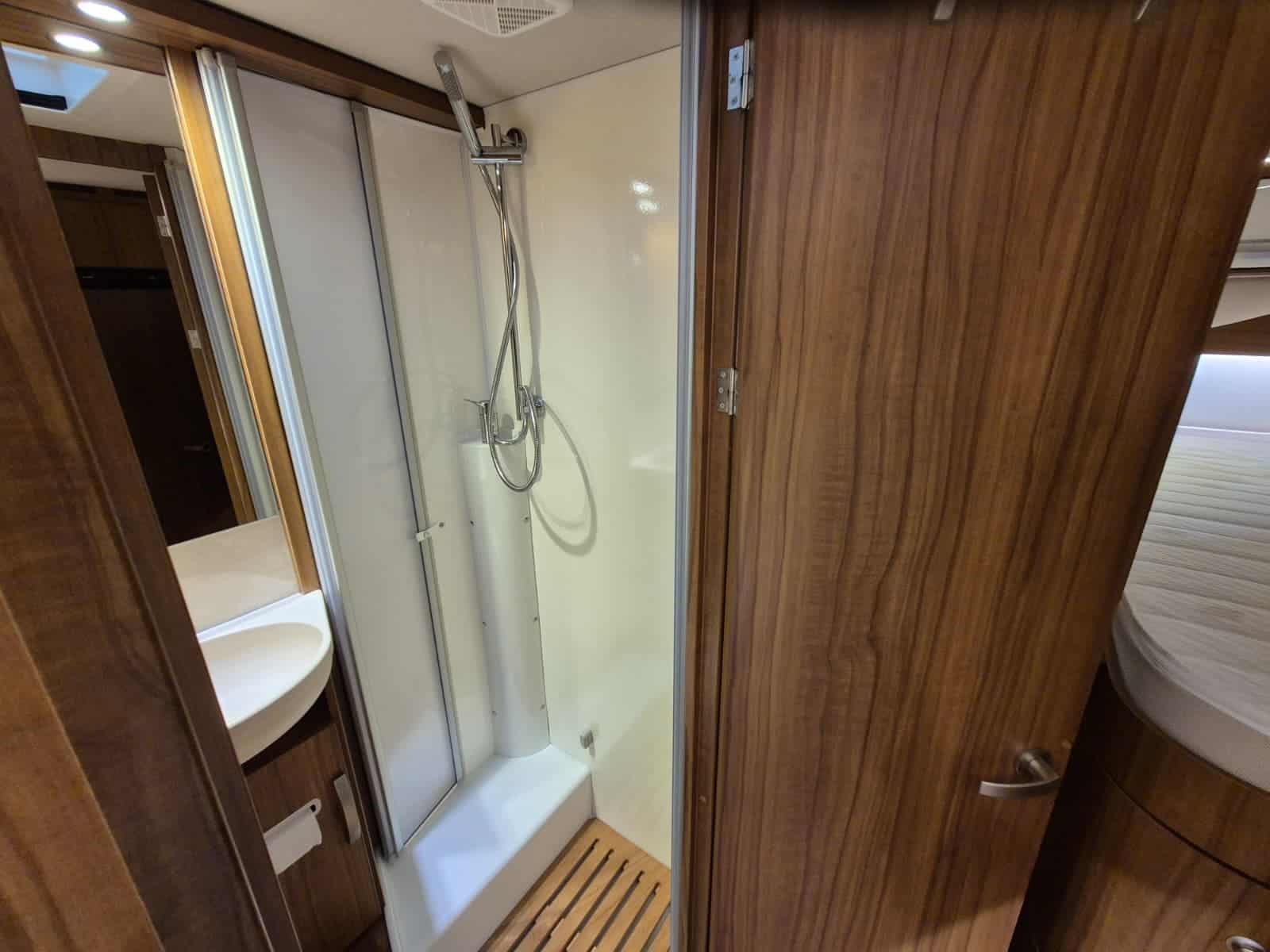 Badkamer in middenopstelling Afgesloten douchecabine Wastafel Cassettetoilet Wintervaste schoon- en vuilwatertanks